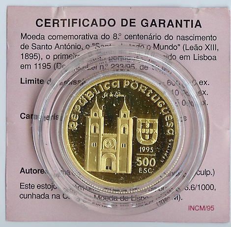 Moeda comemorativa do 8.° centenário do nascimento de Santo António o”Santo de todo o Mundo “ (Leão XIII,1895),o primeiro Santo português ,nascido em Lisboa em 1195 (Decreto-Lei n.°233/95.de 13.09).